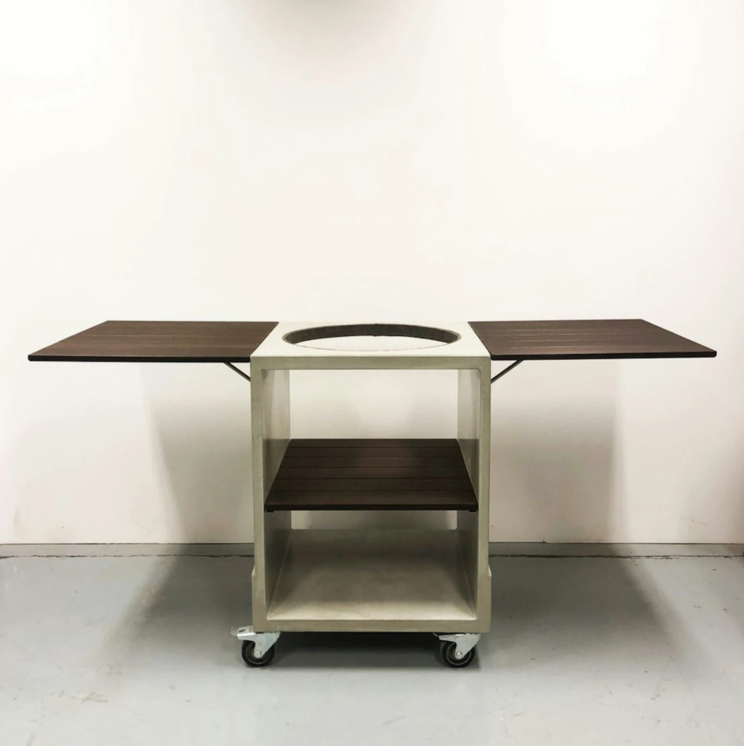 Die elegante, platzsparende und gleichzeitig äußerst robuste Lösung für die Terrasse, den Balkon oder Garten jeder Größe: das „Two-Kitchen Betonmodul“ verwandelt Ihr Big Green Egg Large in eine vielseitige mobile Grillküche. Selbst auf engstem Raum kann das Betonuntergestell flexibel eingesetzt werden und bietet dank seiner ausklappbaren Seitentische viel zusätzliche Grill- und Arbeitsfläche. Beton, Edelstahlelemente und Bambusholz werden in einem schlichten, modernen und ansprechenden Design zu einer stimmigen Einheit verbunden. Maße: 90 cm hoch, 68 cm breit, 68 cm tief Gewicht: 160 kg (ohne Big Green Egg)