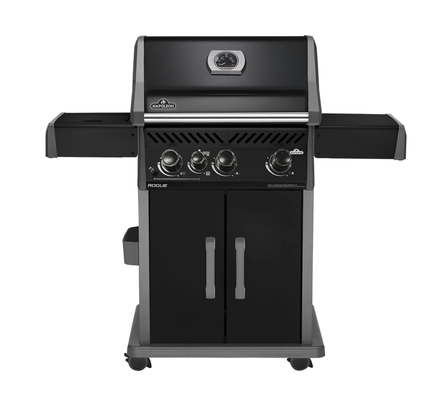 Mit der NAPOLEON Rogue- Serie ist Grillgenuss der Spitzenklasse garantiert. Der limitierte NAPOLEON Rogue 3 „All Black“ Gasgrill ist der Eye-Catcher in der Rogue- Serie und findet dank seiner kompakten Größe auf jeder Terrasse und Balkon seinen Platz. Er verfügt neben exzellenter Leistungsstärke, hohem Komfort und edlem Design über viele weitere Extras wie zum Beispiel ein ACCU-PROBE Thermometer , einen hochwertigen WAVE Stabgrillrost aus Edelstahl , duale Edelstahl- Flammschutzeinsätze, zwei klappbare Seitentische und einen Infrarot SIZZLE ZONE Seitenbrenner. Bei dieser limitierten Version , bekommen Sie die passende Abdeckhaube und das neue Napoleon Grillbuch gratis dazu. Grillfläche : 60 x 45 cm