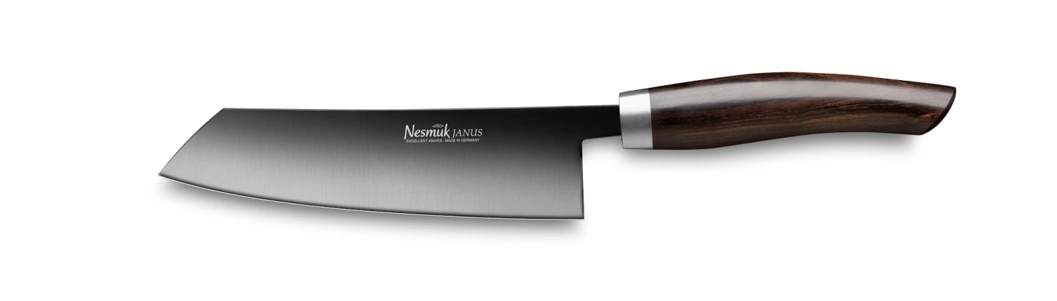 DER KLEINE ALLESKÖNNER Nesmuk JANUS – unverkennbar an der schwarzen Klinge – wird aus einem Hochleistungsstahl mit Niobanteil gefertigt und mit einer hochwertigen Diamond-Like-Carbon Beschichtung (DLC) veredelt, die die funktionalen Eigenschaften der Klinge optimiert. Das Kochmesser mit einer 140 mm langen und 3 mm starken, einseitig hohlgeschliffenen Klinge ist der Allrounder, mit dem man rund 80 % aller Schneidaufgaben erledigen kann. Als „Basis-Messer“ in jeder Küche unverzichtbar und vielseitig einsetzbar.