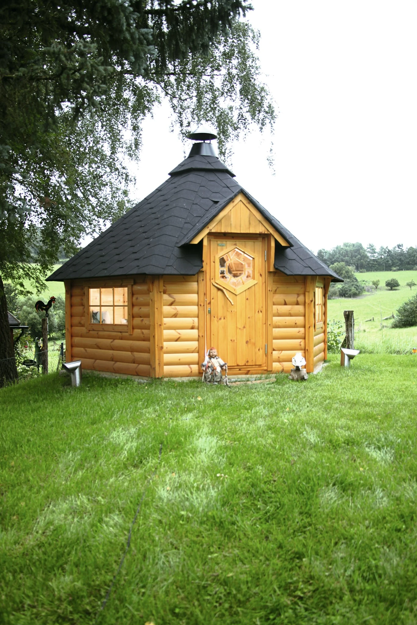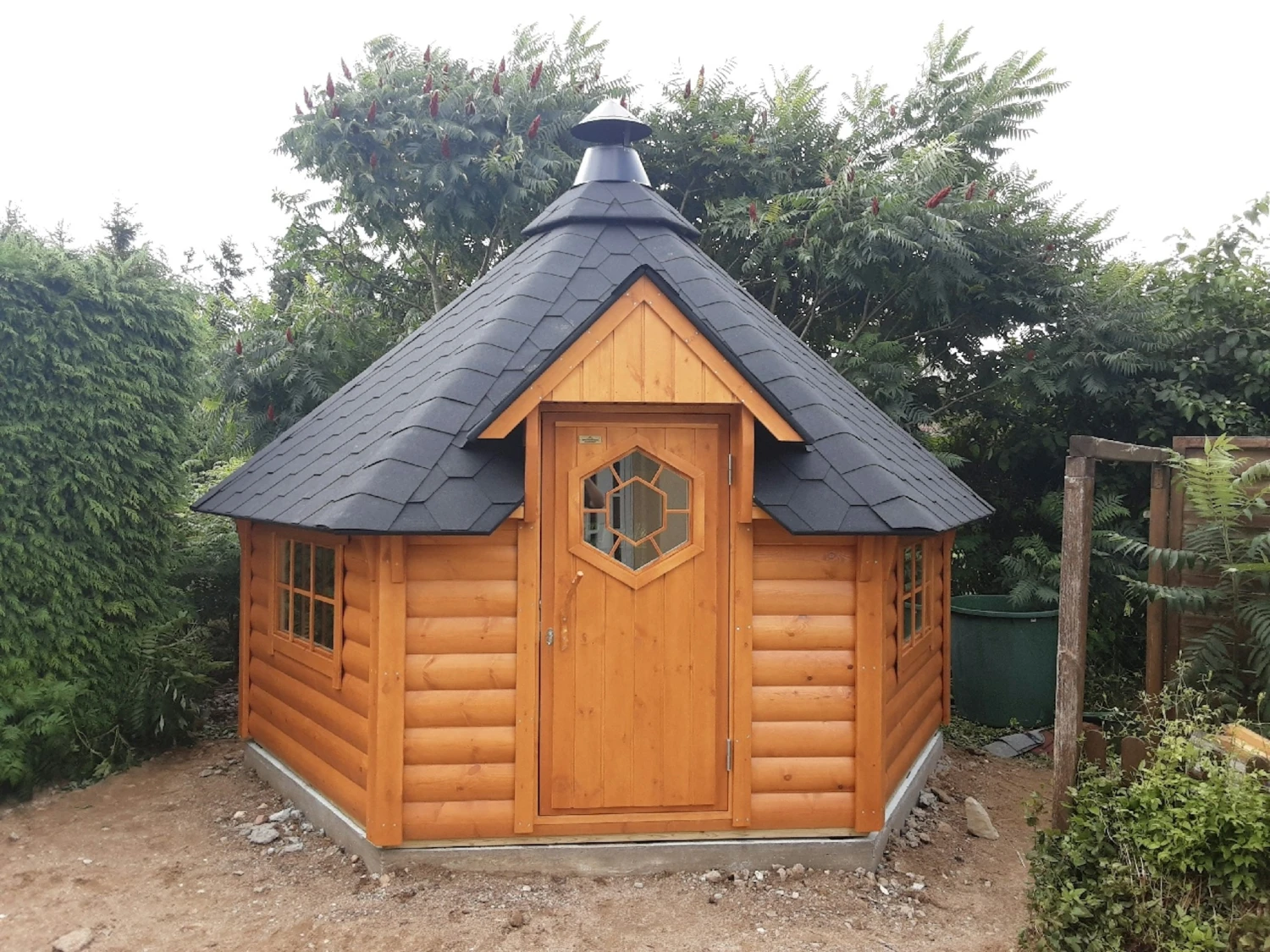 | Set-Ausstattung | Grillanlage mit verstellbarer Rauchabzugshaube, Grilltische, umlaufende Sitzbänke, Leimholz-Tür mit Zylinderschloss, Fußboden-Roste, fertig geschindelte Dachelemente mit schwarzen Schindeln |